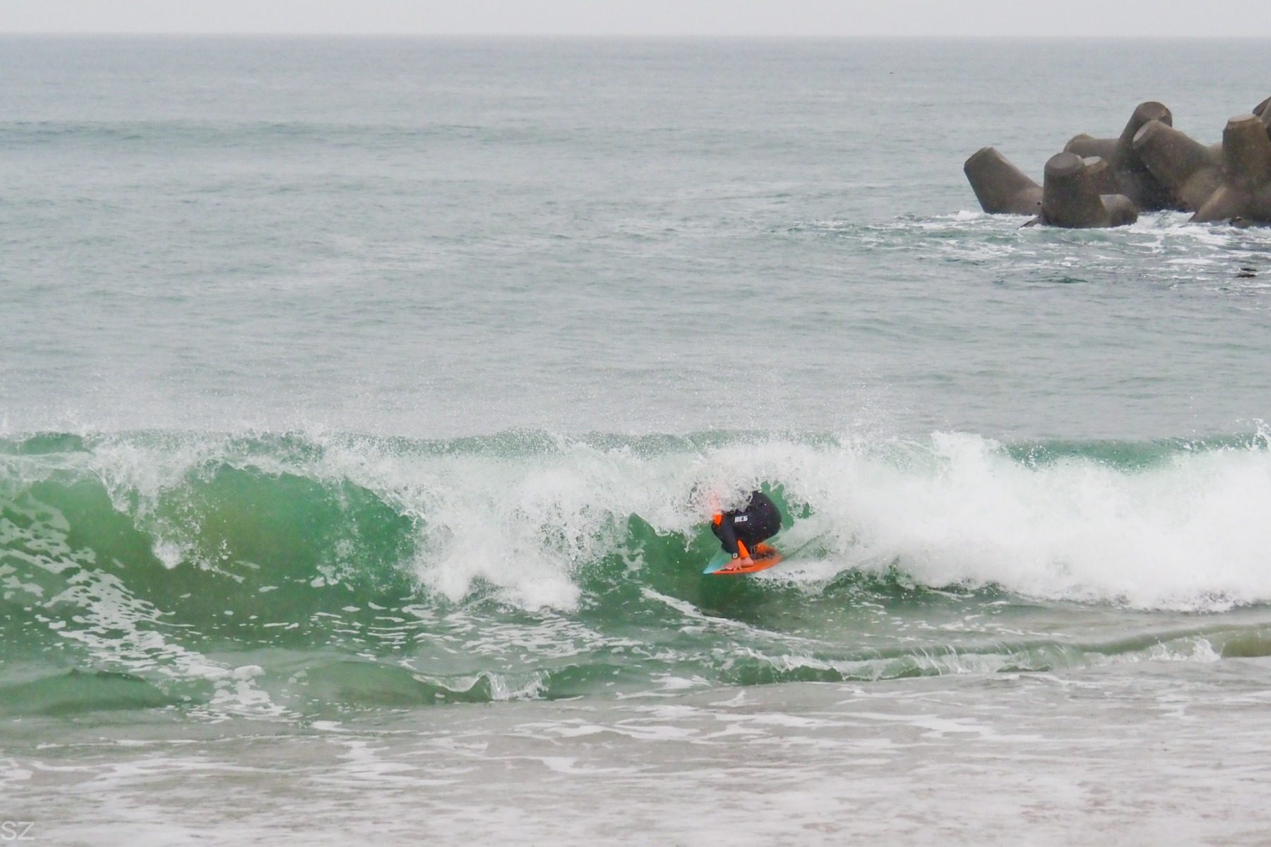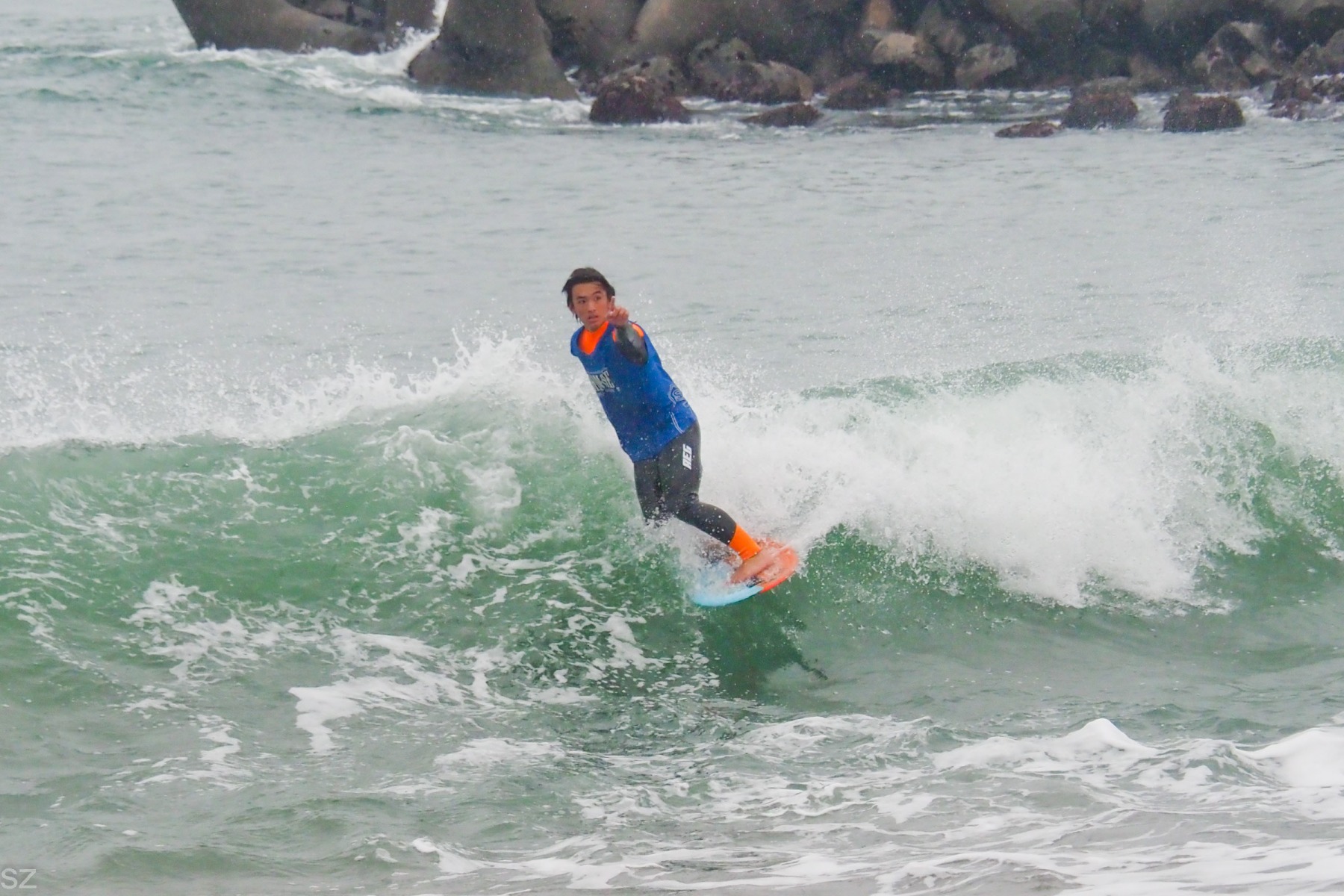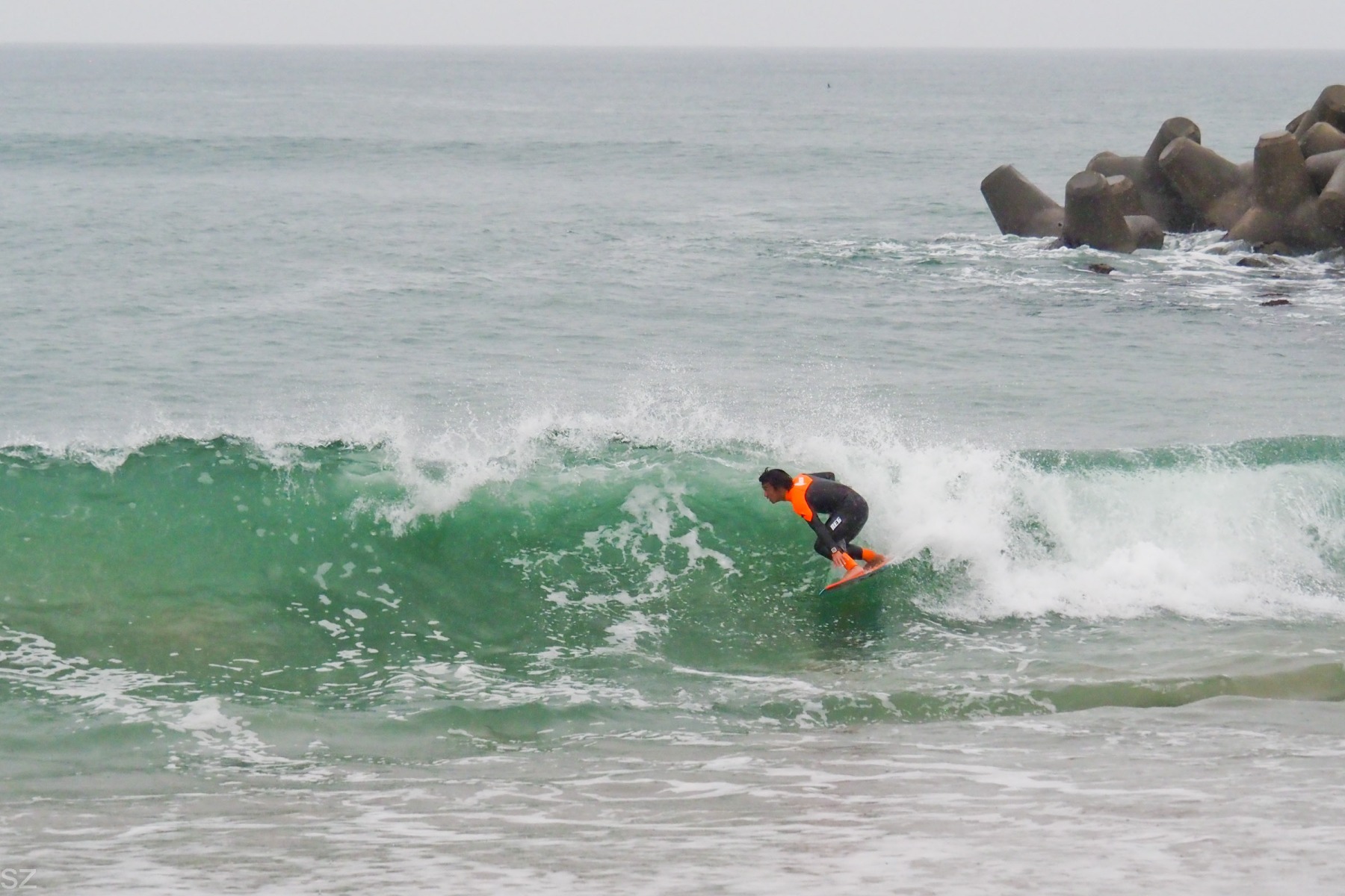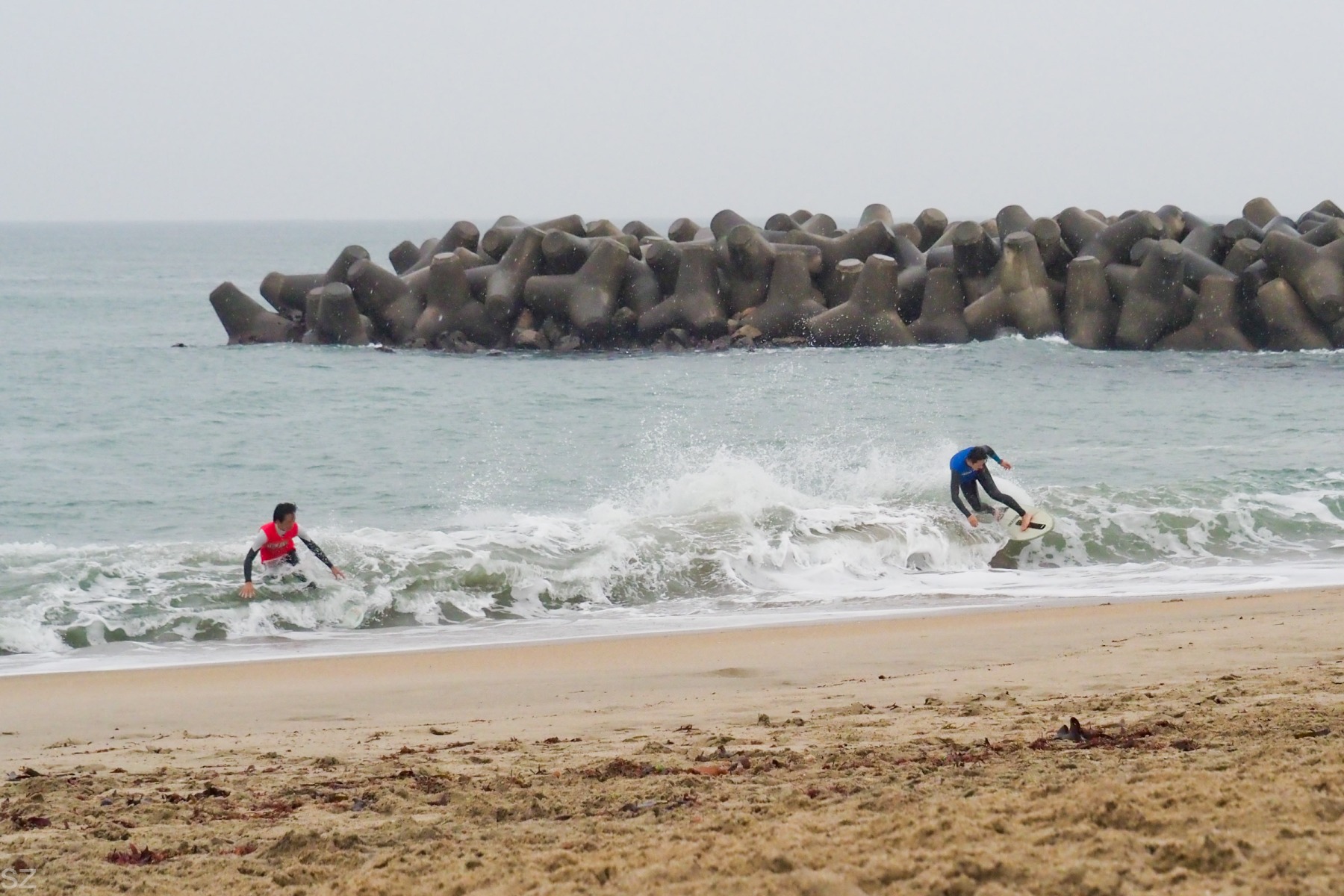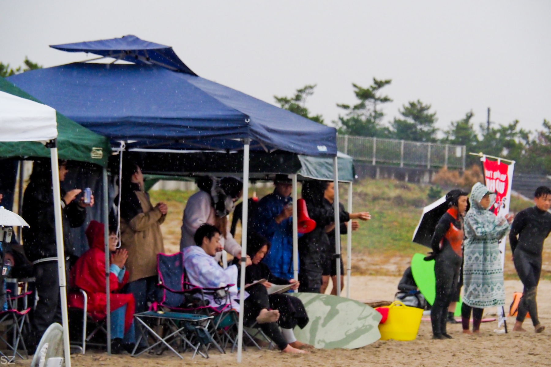 断続的な小雨が続く中、恒例の芋煮で体を温めつつ大会を観戦。波は大きく風は弱いオフショア、波風の条件は悪くないが傾斜がやや緩く遠くで割れる波が多いのでなかなかハードでしたが見応えのあるライディングが多く撮影出来ました。