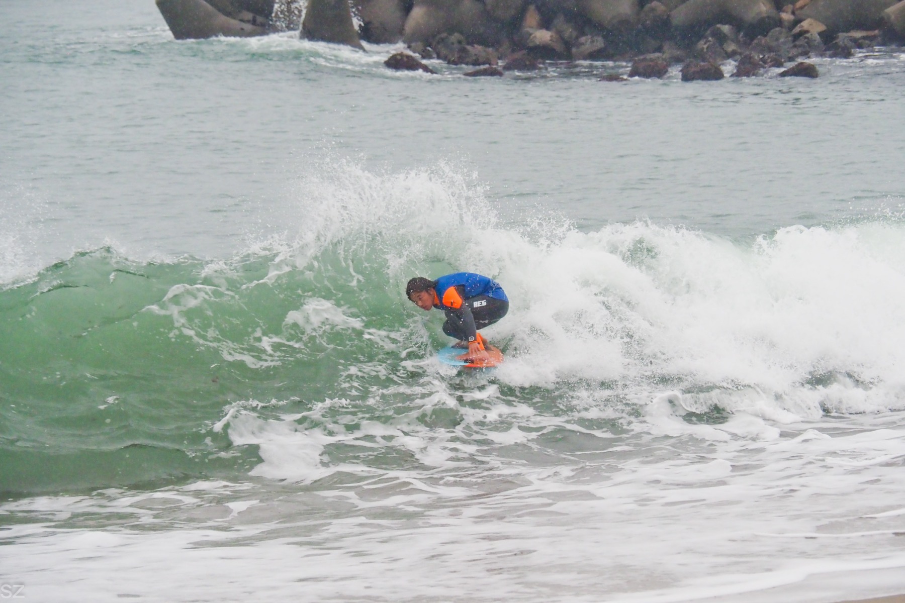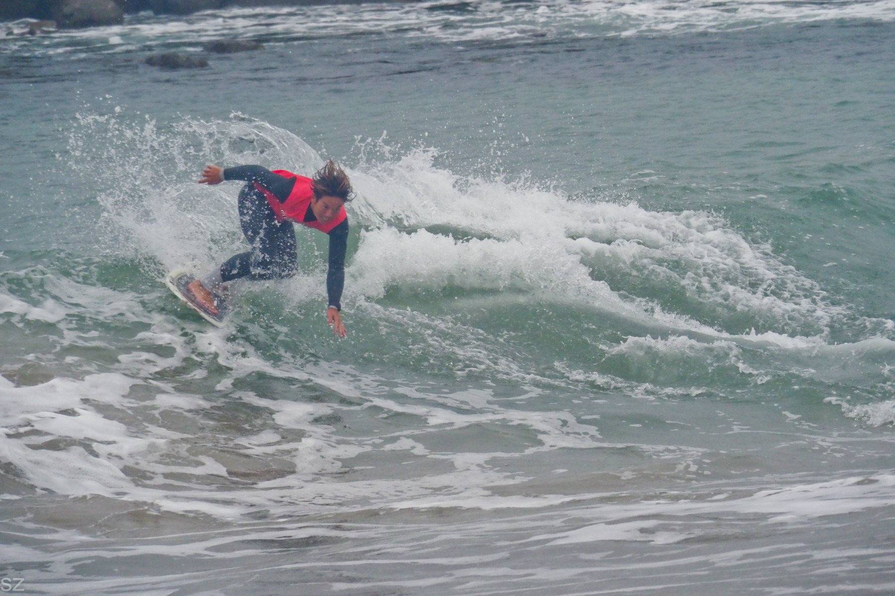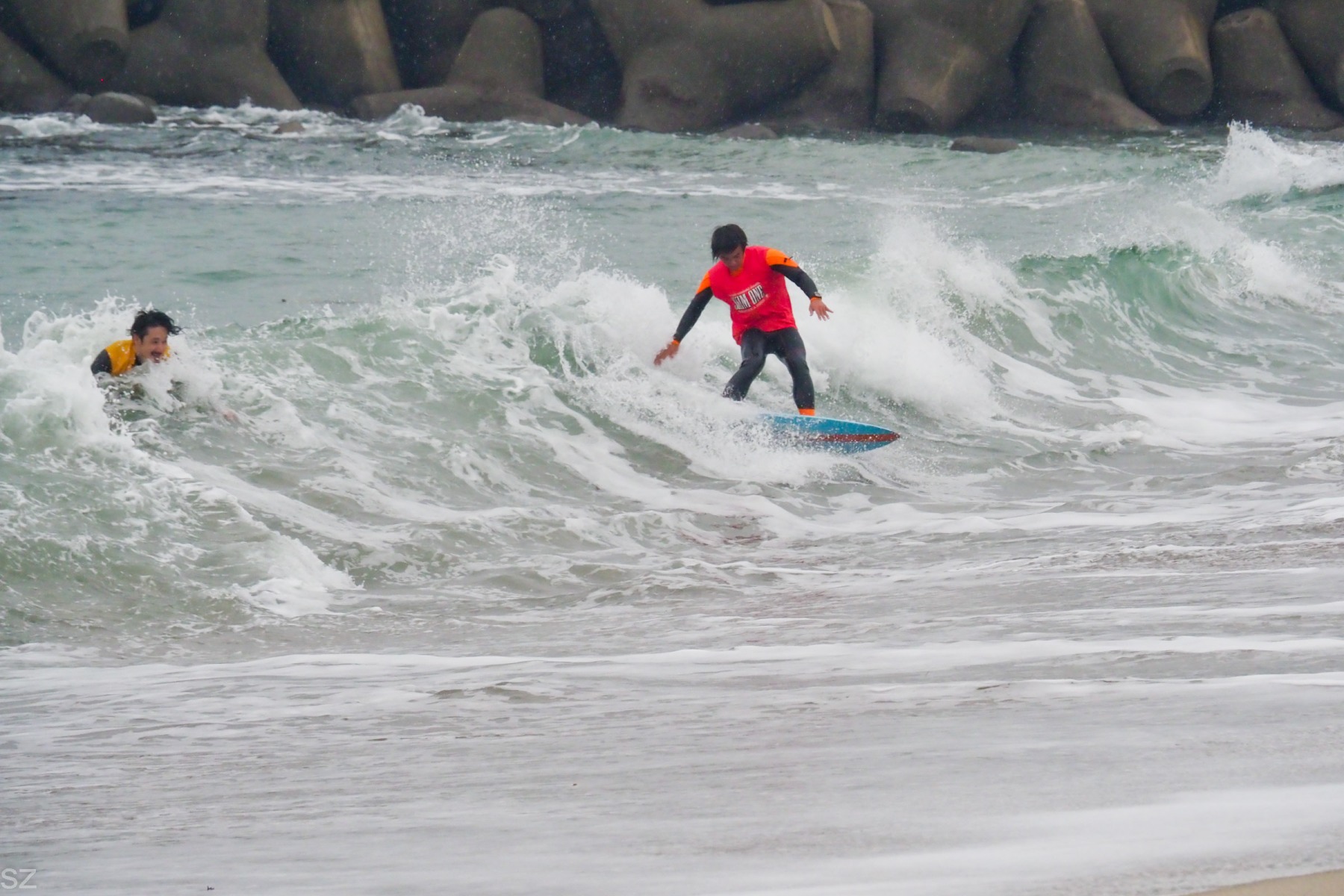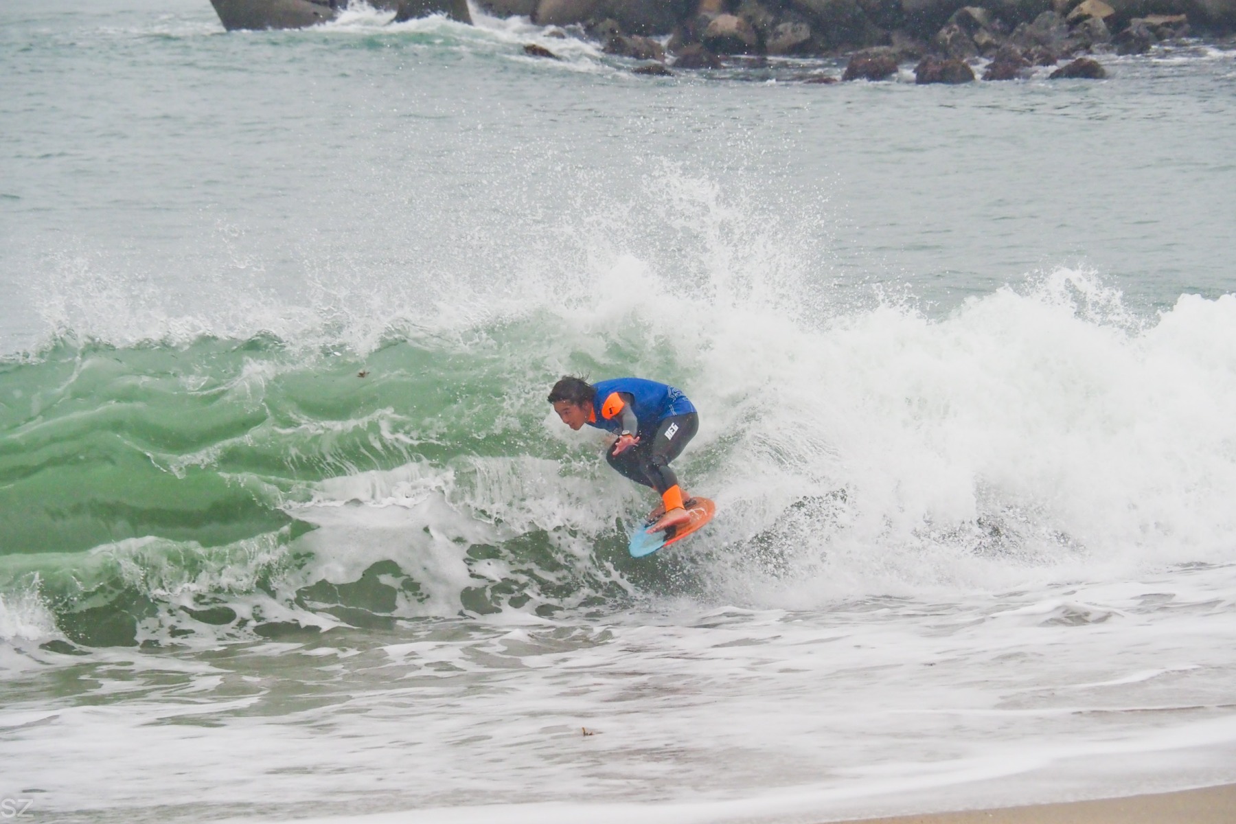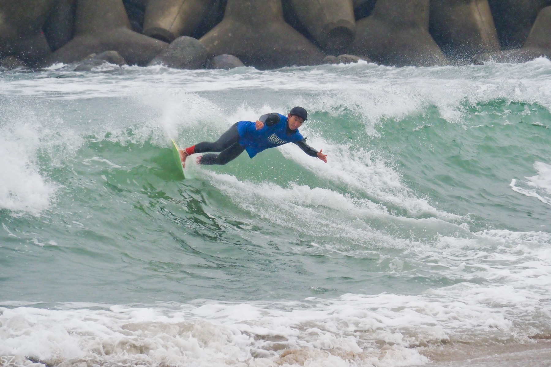 断続的な小雨が続く中、恒例の芋煮で体を温めつつ大会を観戦。波は大きく風は弱いオフショア、波風の条件は悪くないが傾斜がやや緩く遠くで割れる波が多いのでなかなかハードでしたが見応えのあるライディングが多く撮影出来ました。