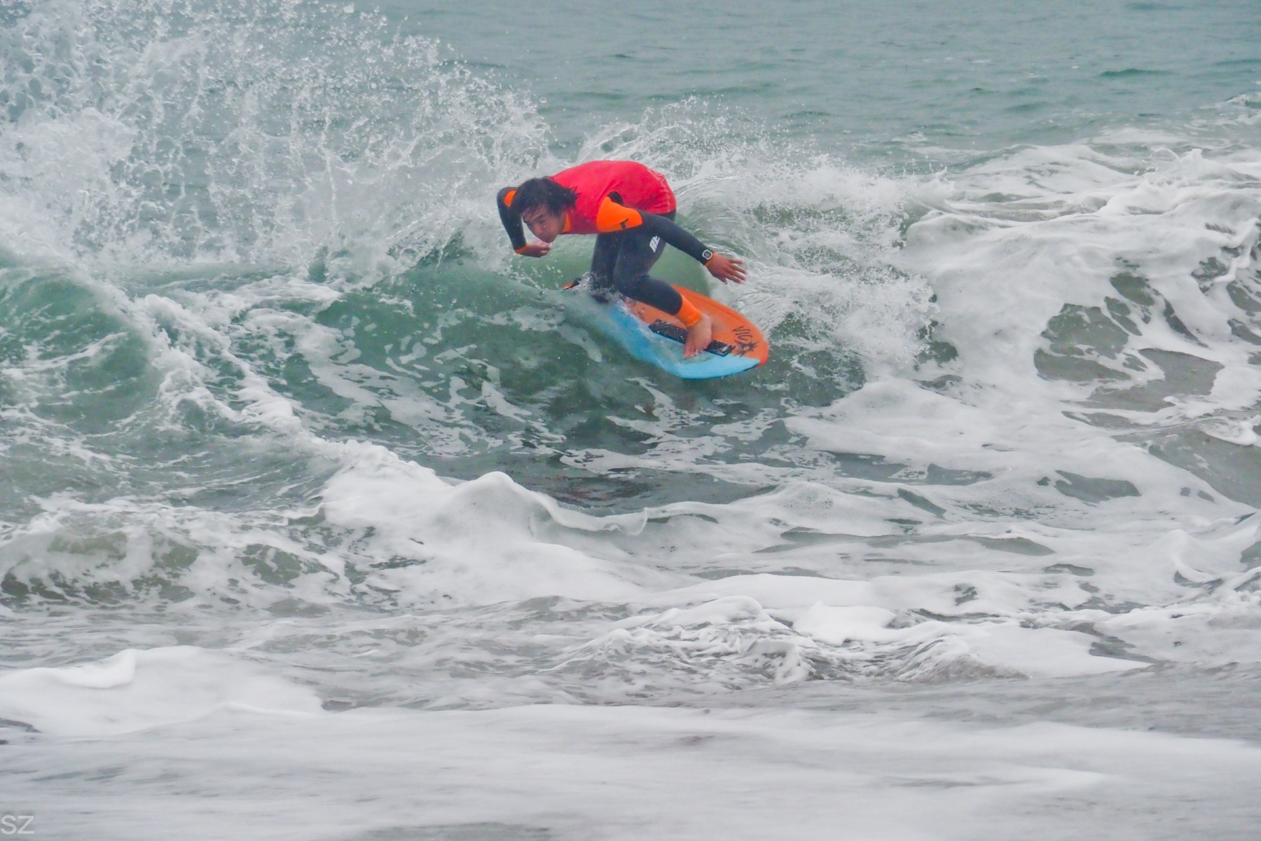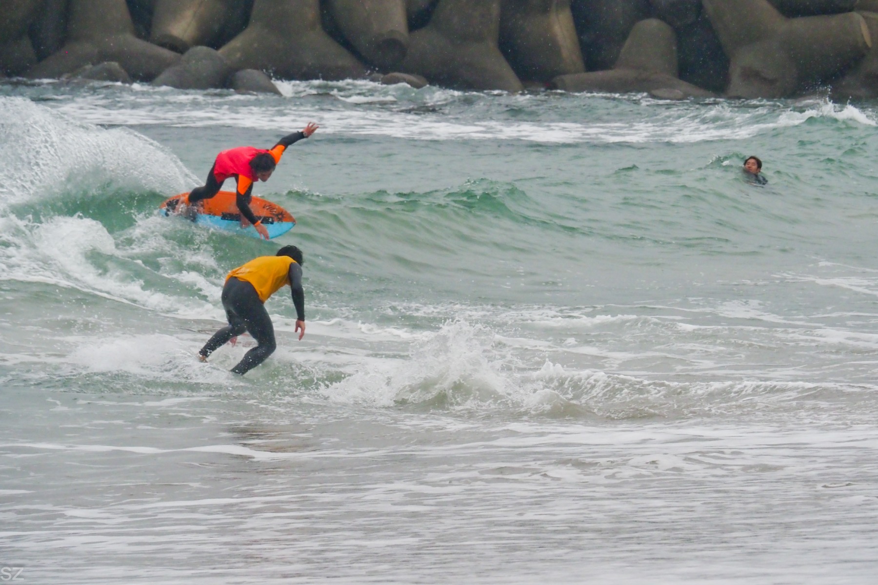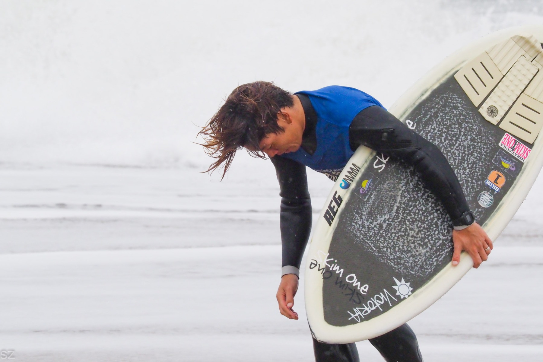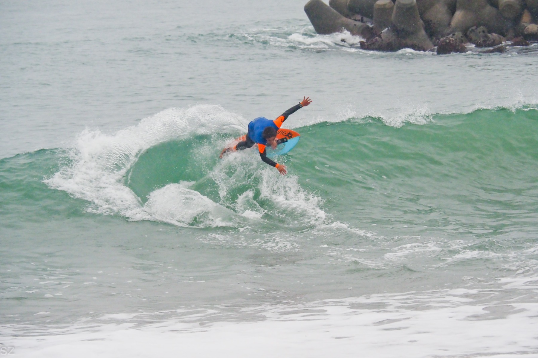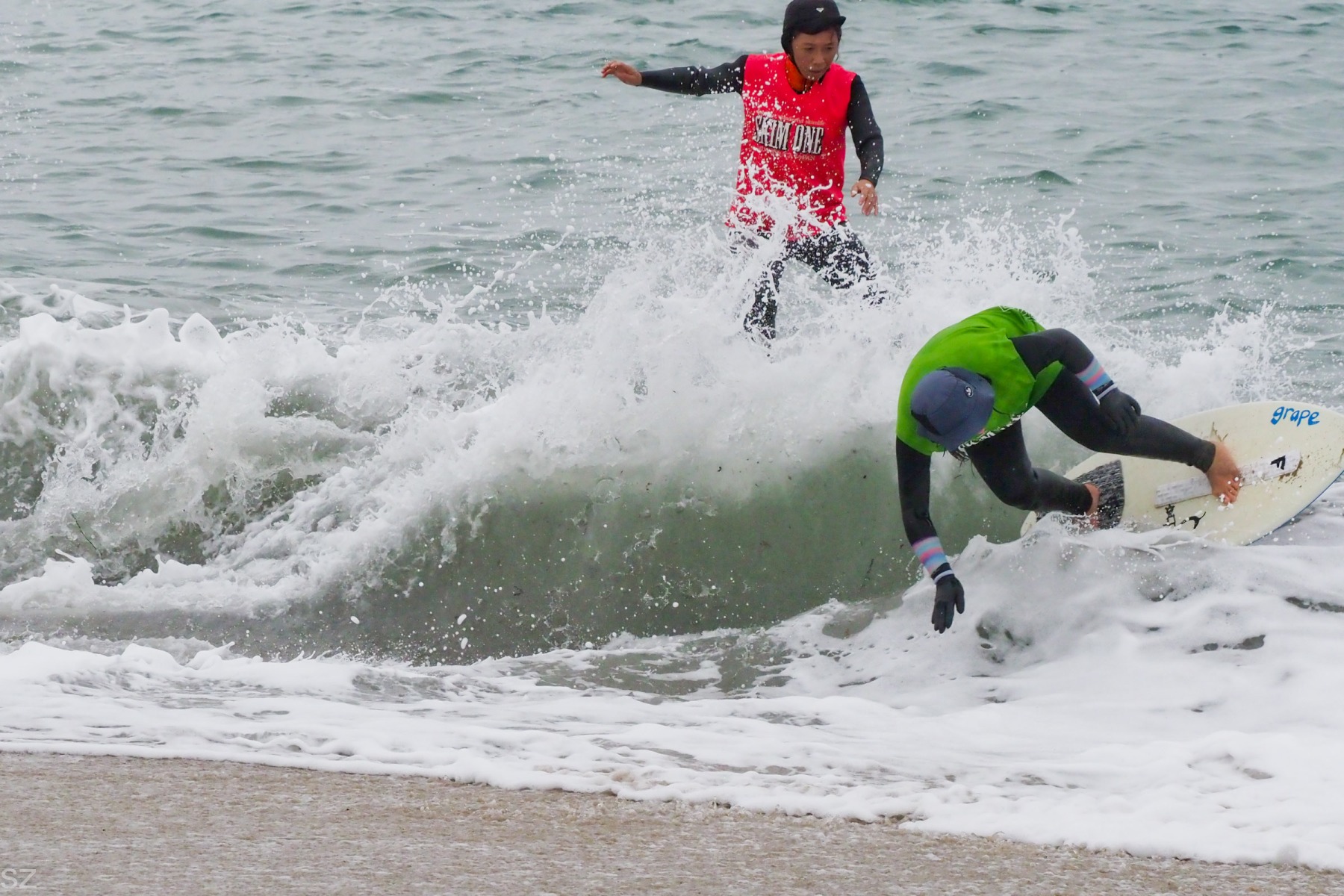 断続的な小雨が続く中、恒例の芋煮で体を温めつつ大会を観戦。波は大きく風は弱いオフショア、波風の条件は悪くないが傾斜がやや緩く遠くで割れる波が多いのでなかなかハードでしたが見応えのあるライディングが多く撮影出来ました。