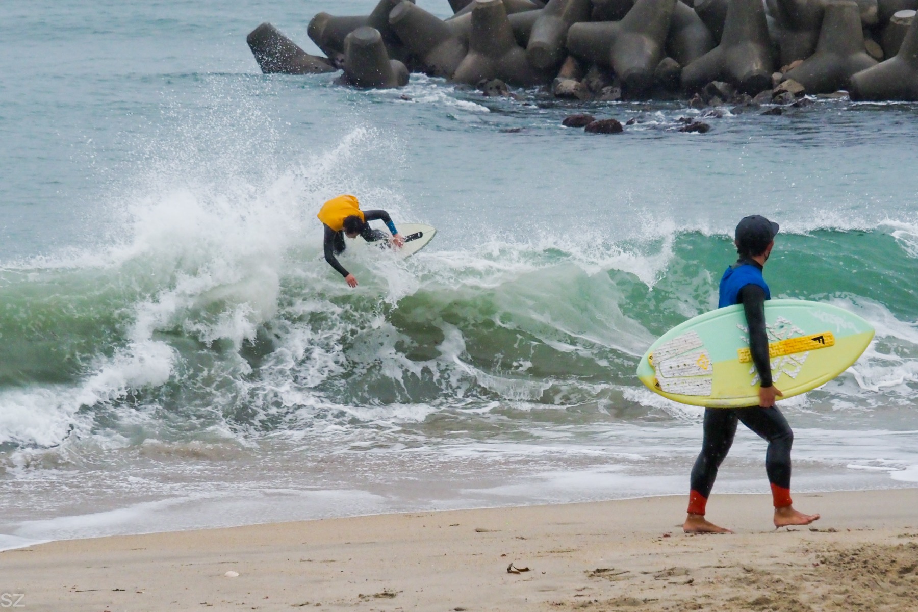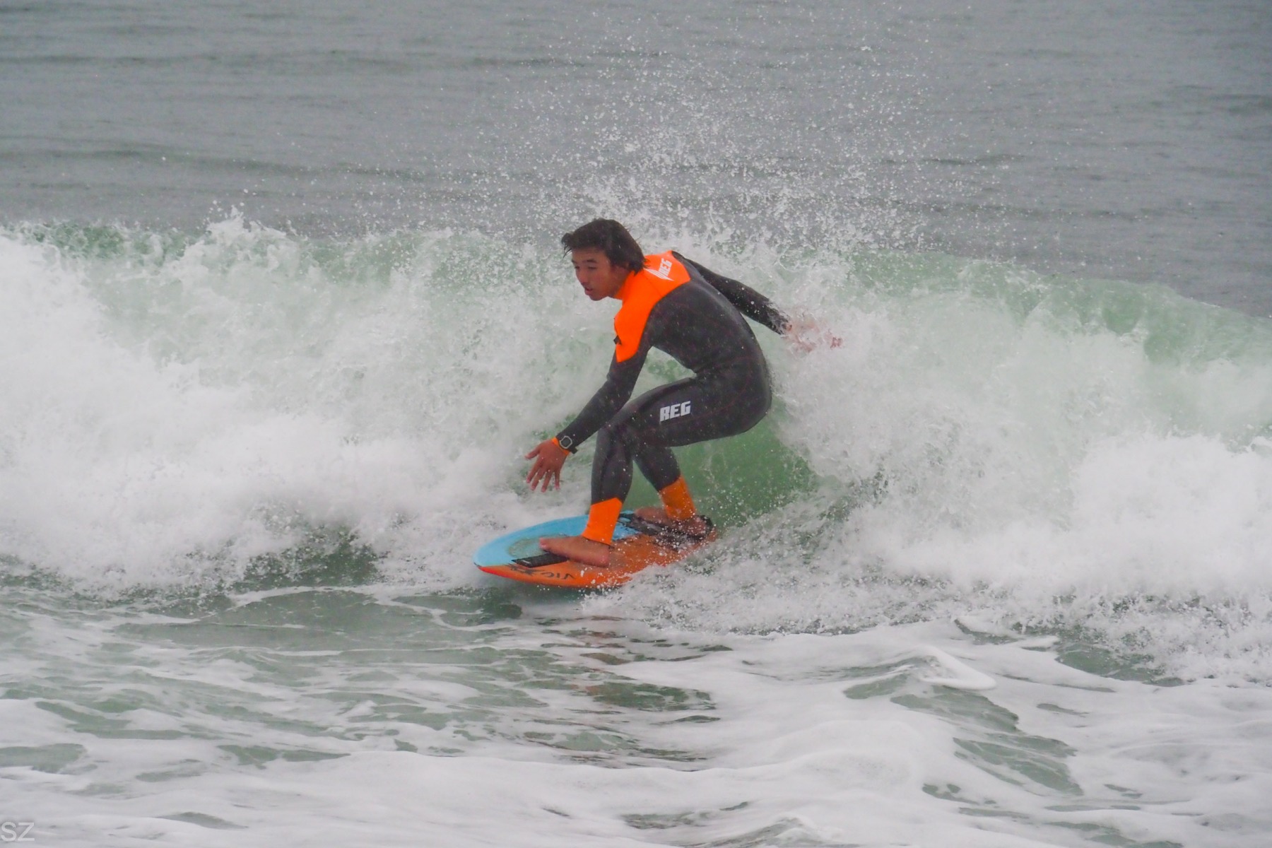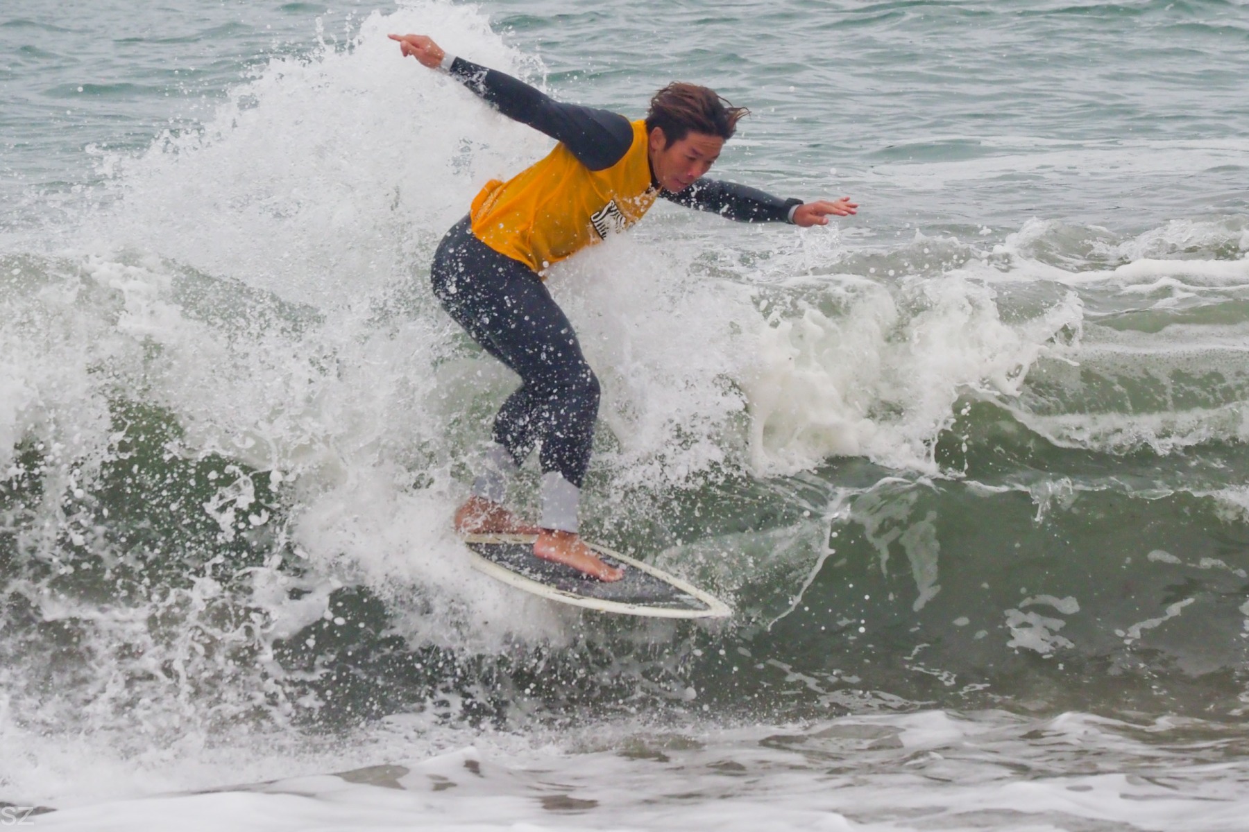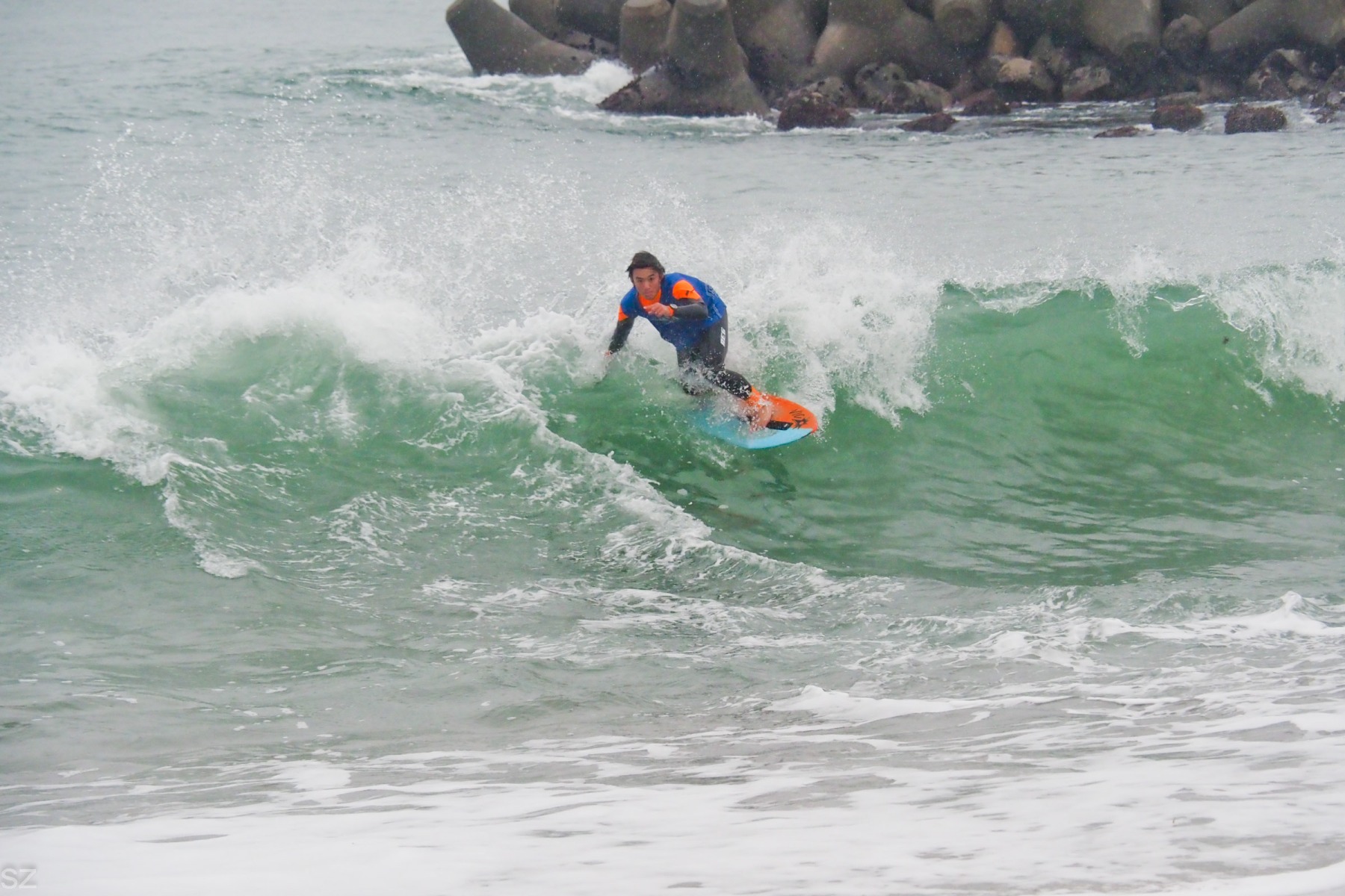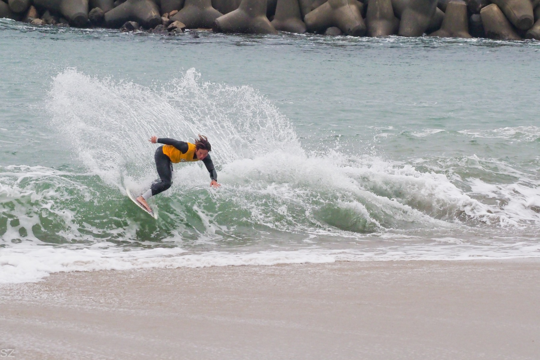 断続的な小雨が続く中、恒例の芋煮で体を温めつつ大会を観戦。波は大きく風は弱いオフショア、波風の条件は悪くないが傾斜がやや緩く遠くで割れる波が多いのでなかなかハードでしたが見応えのあるライディングが多く撮影出来ました。
