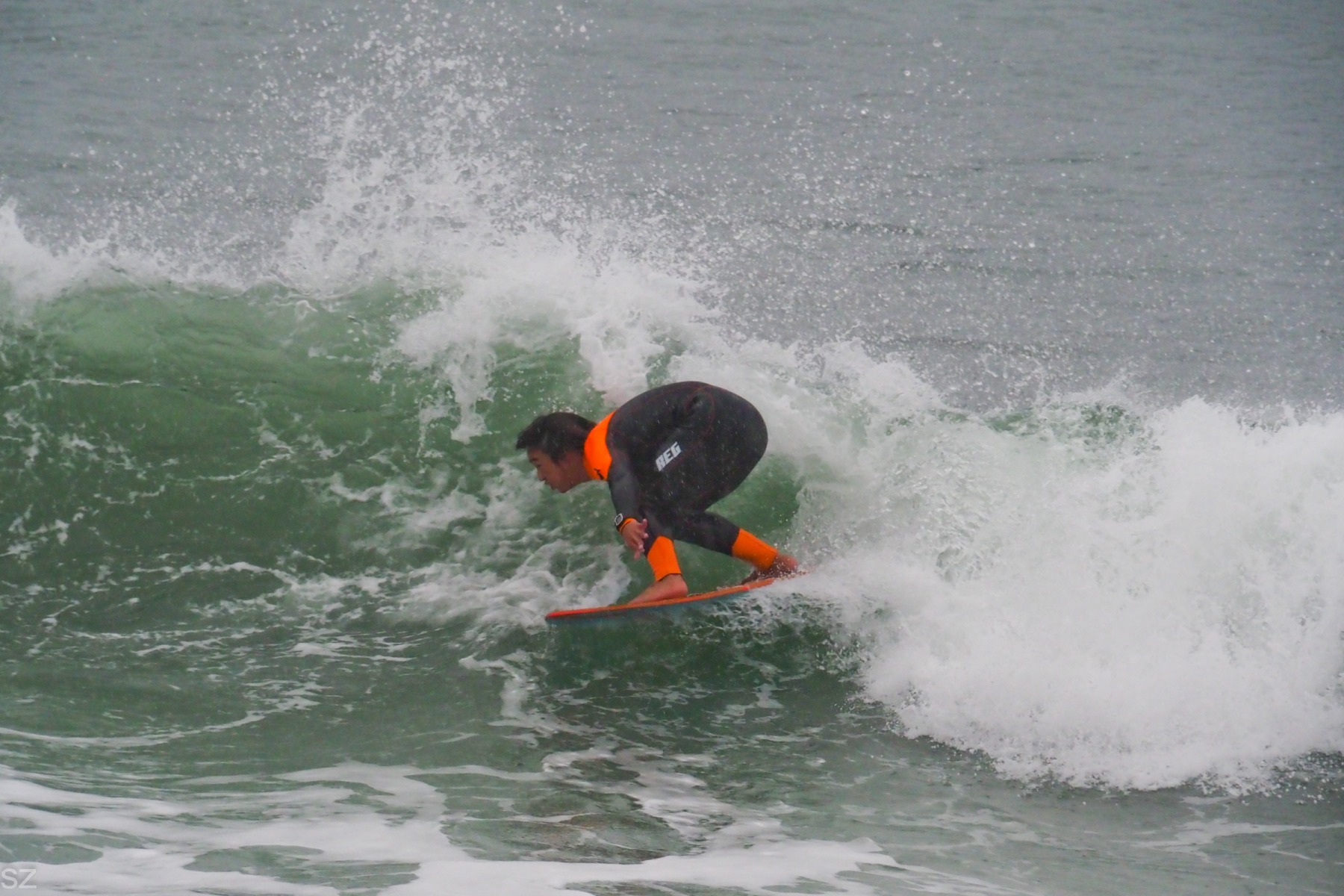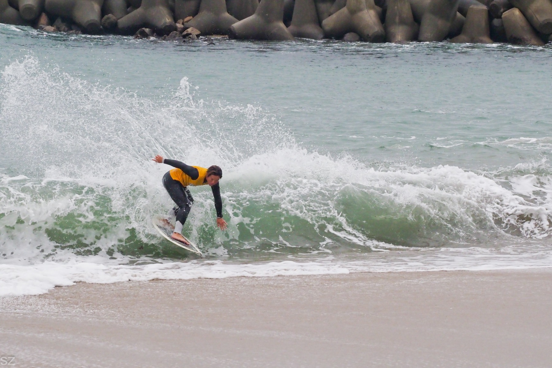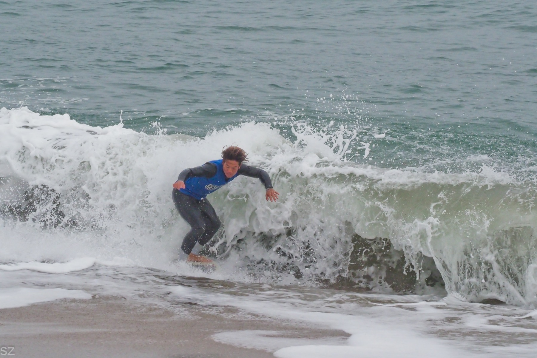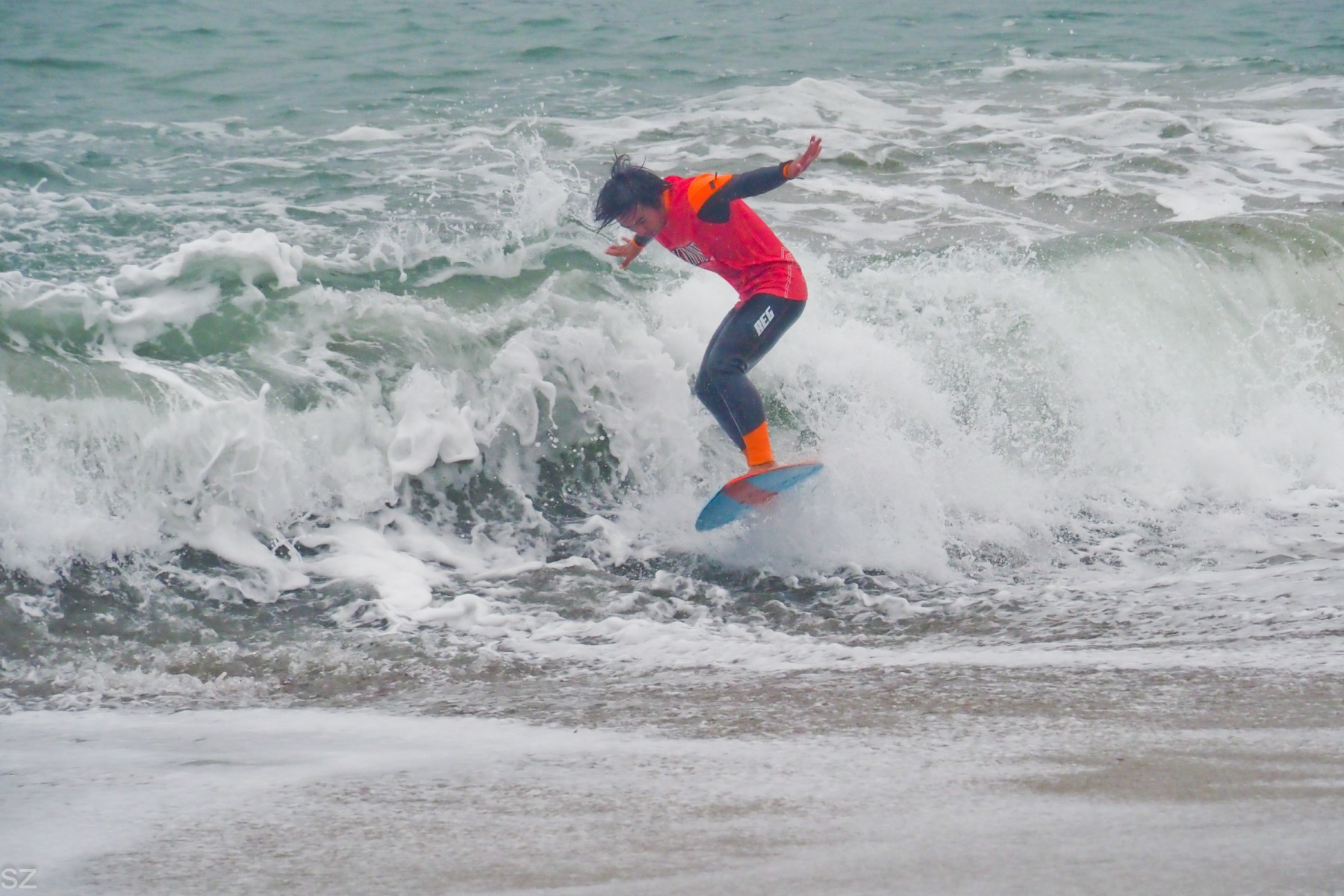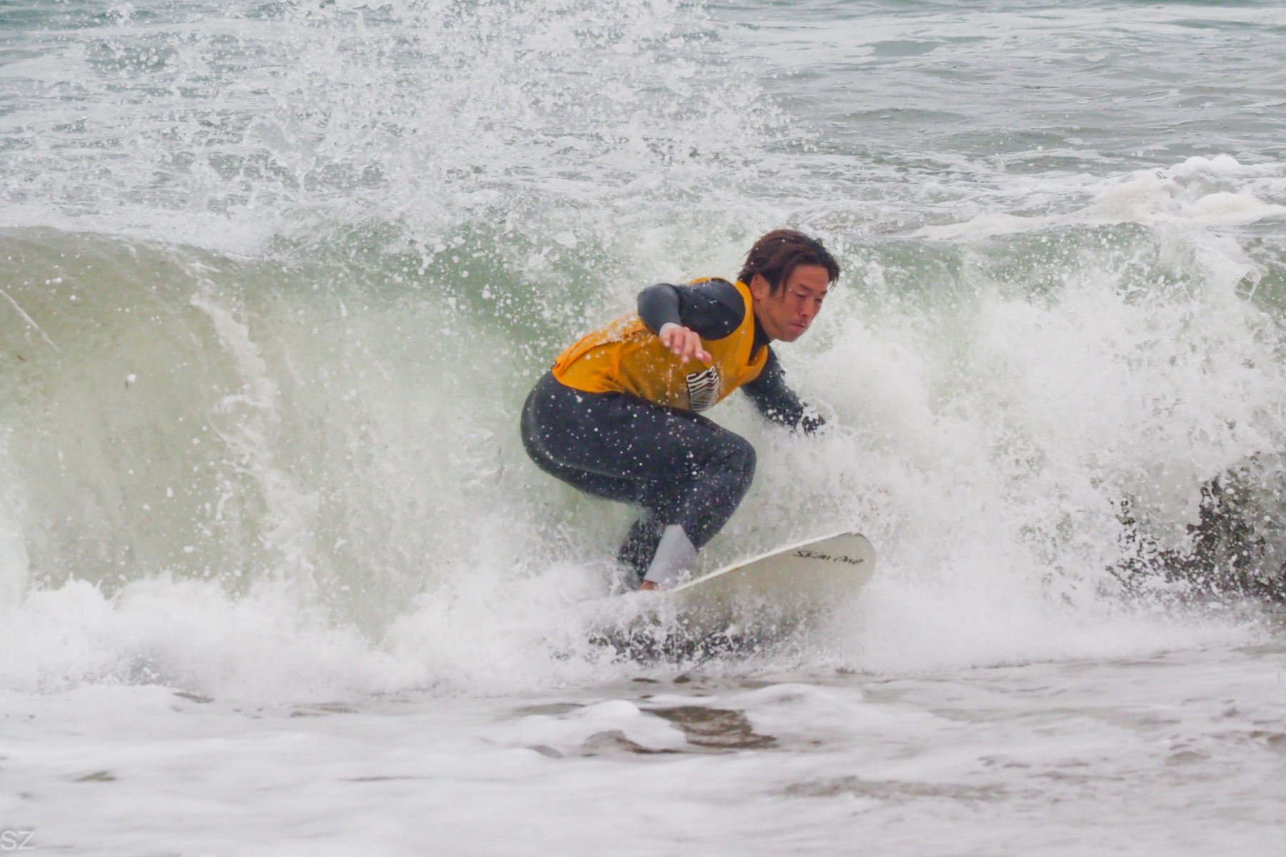 断続的な小雨が続く中、恒例の芋煮で体を温めつつ大会を観戦。波は大きく風は弱いオフショア、波風の条件は悪くないが傾斜がやや緩く遠くで割れる波が多いのでなかなかハードでしたが見応えのあるライディングが多く撮影出来ました。