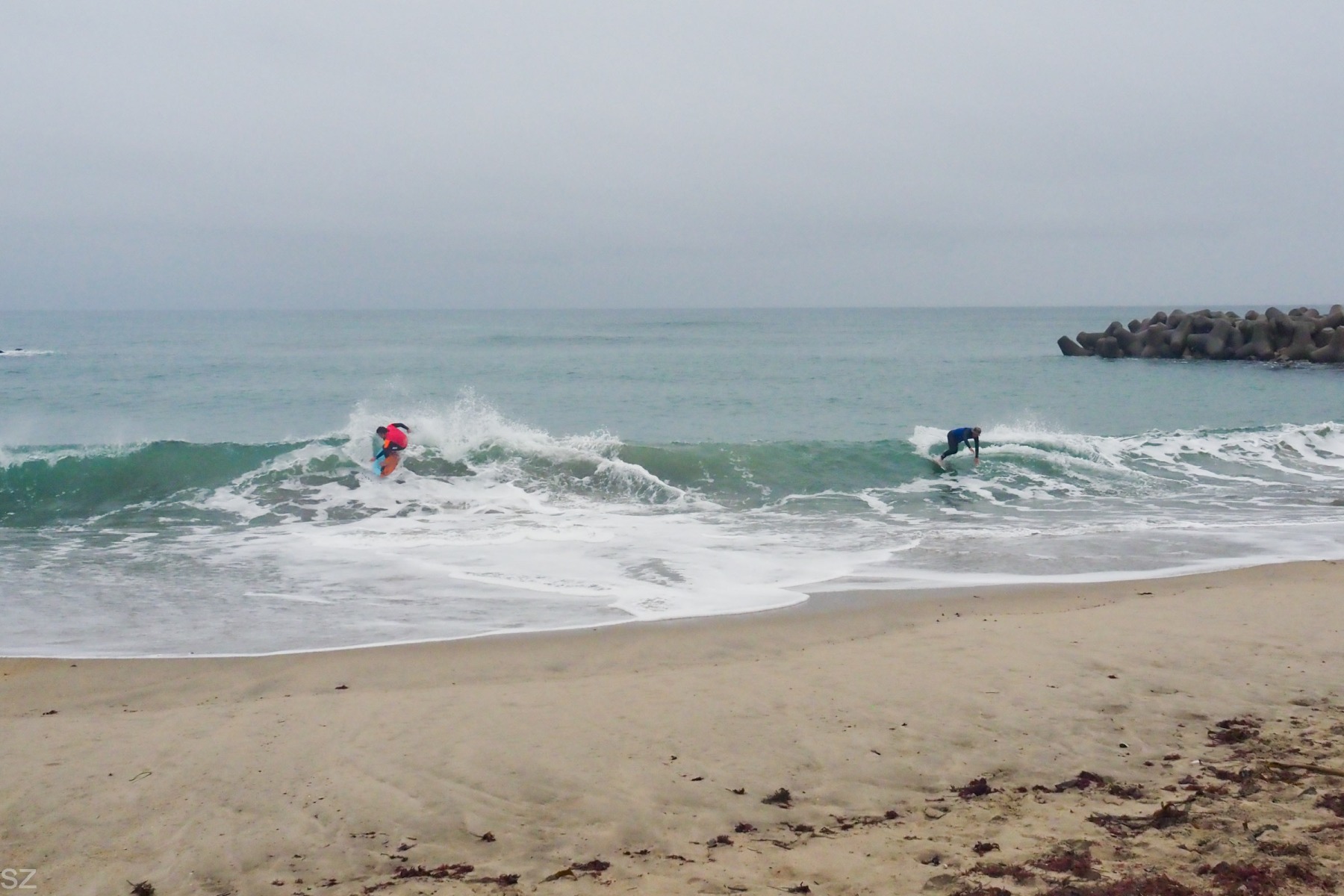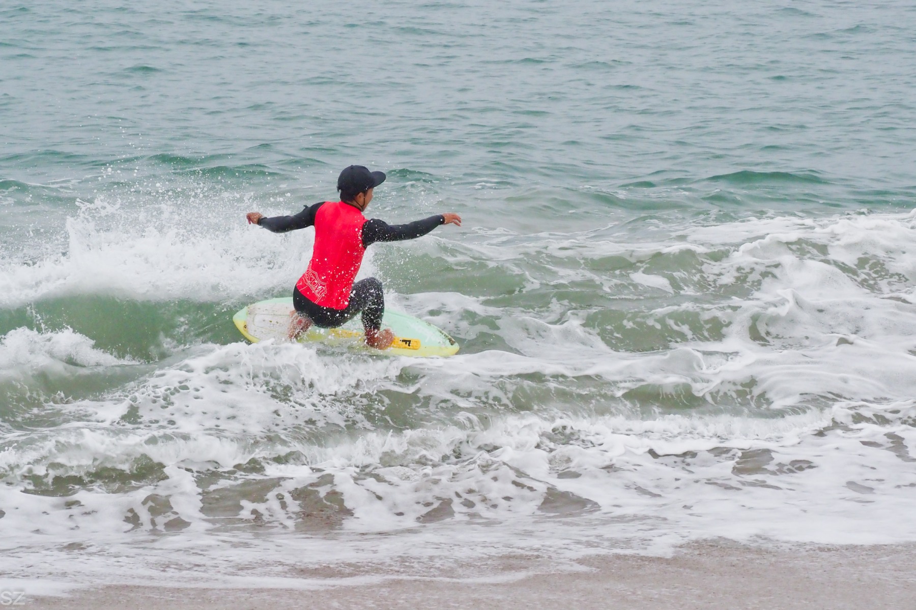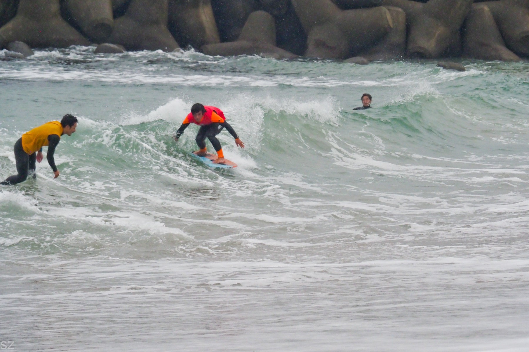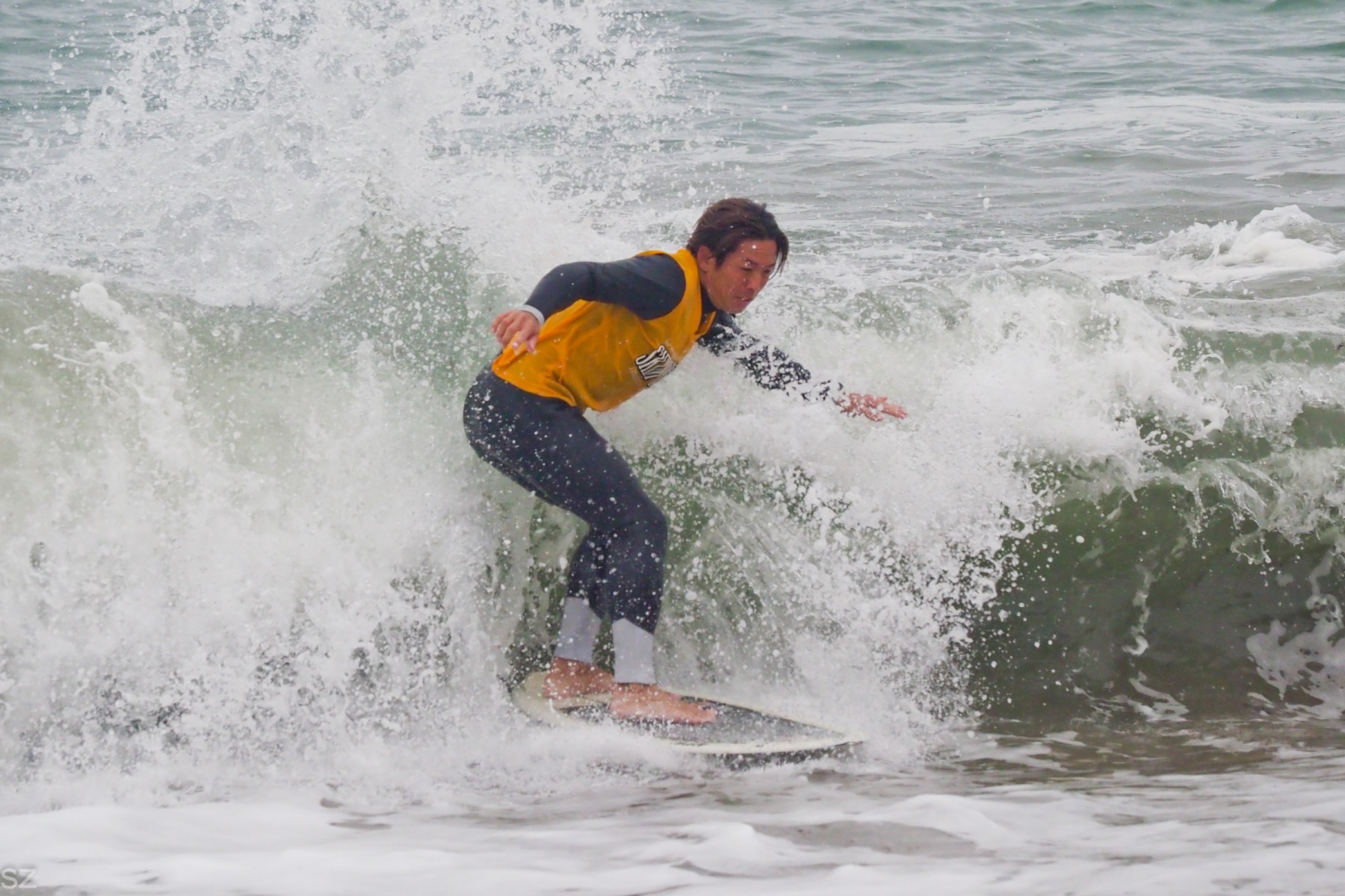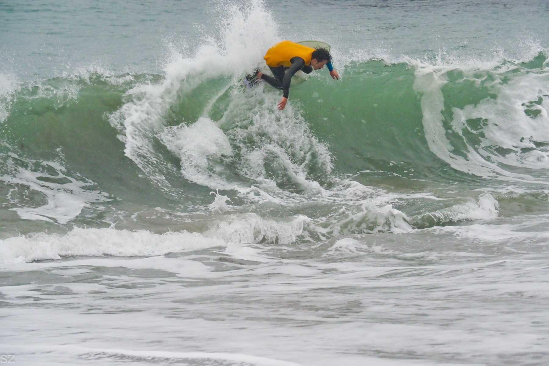 断続的な小雨が続く中、恒例の芋煮で体を温めつつ大会を観戦。波は大きく風は弱いオフショア、波風の条件は悪くないが傾斜がやや緩く遠くで割れる波が多いのでなかなかハードでしたが見応えのあるライディングが多く撮影出来ました。