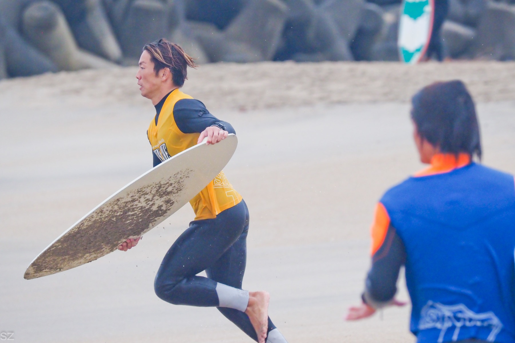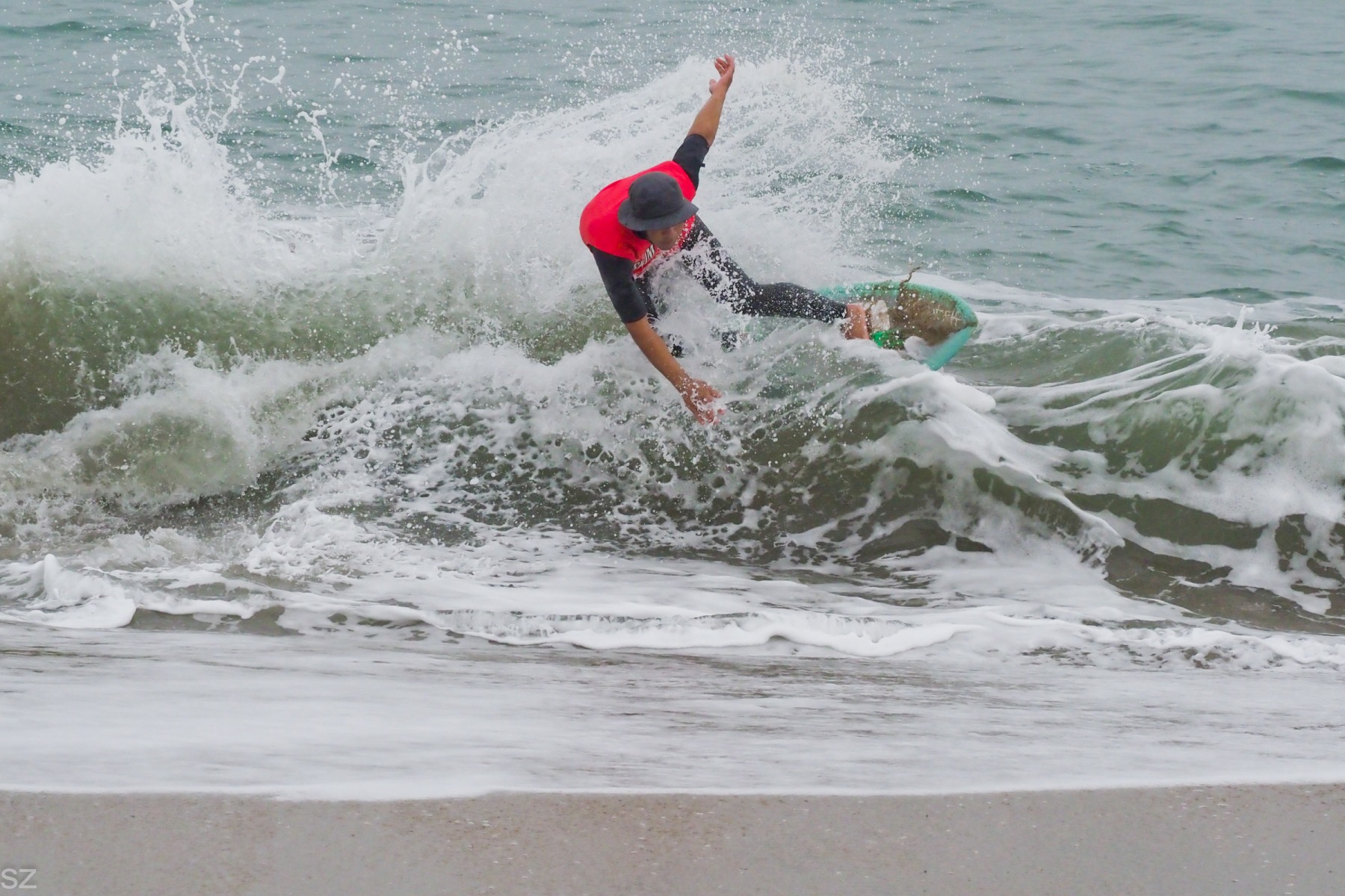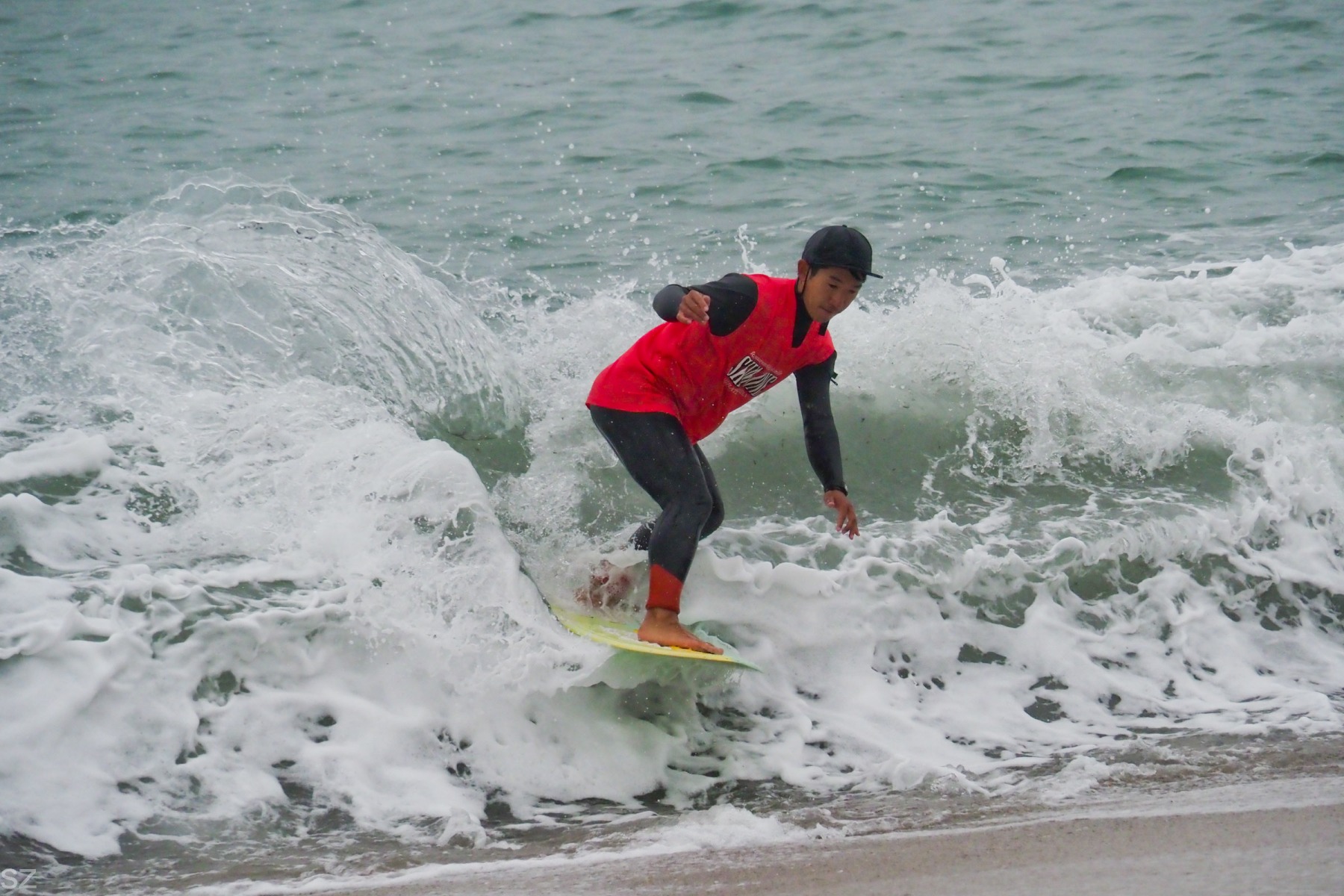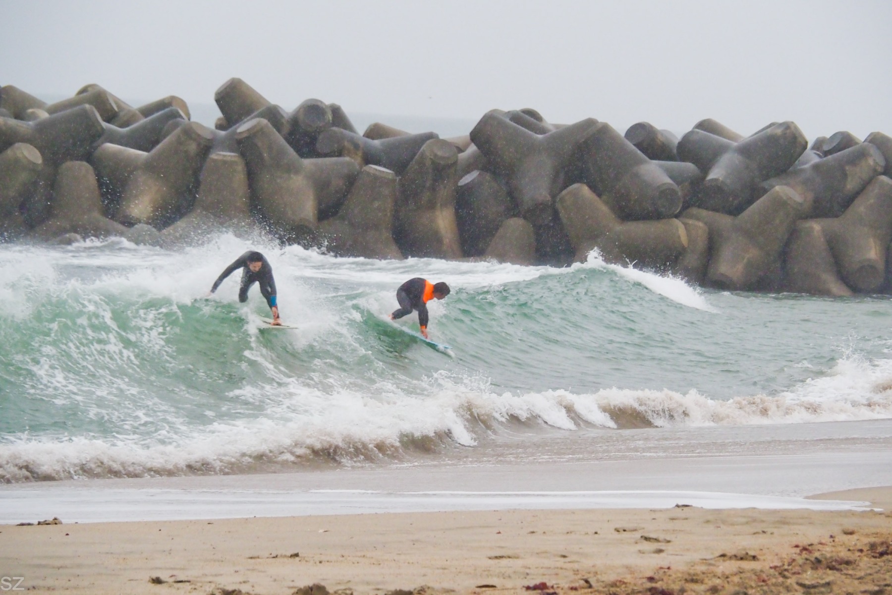 断続的な小雨が続く中、恒例の芋煮で体を温めつつ大会を観戦。波は大きく風は弱いオフショア、波風の条件は悪くないが傾斜がやや緩く遠くで割れる波が多いのでなかなかハードでしたが見応えのあるライディングが多く撮影出来ました。